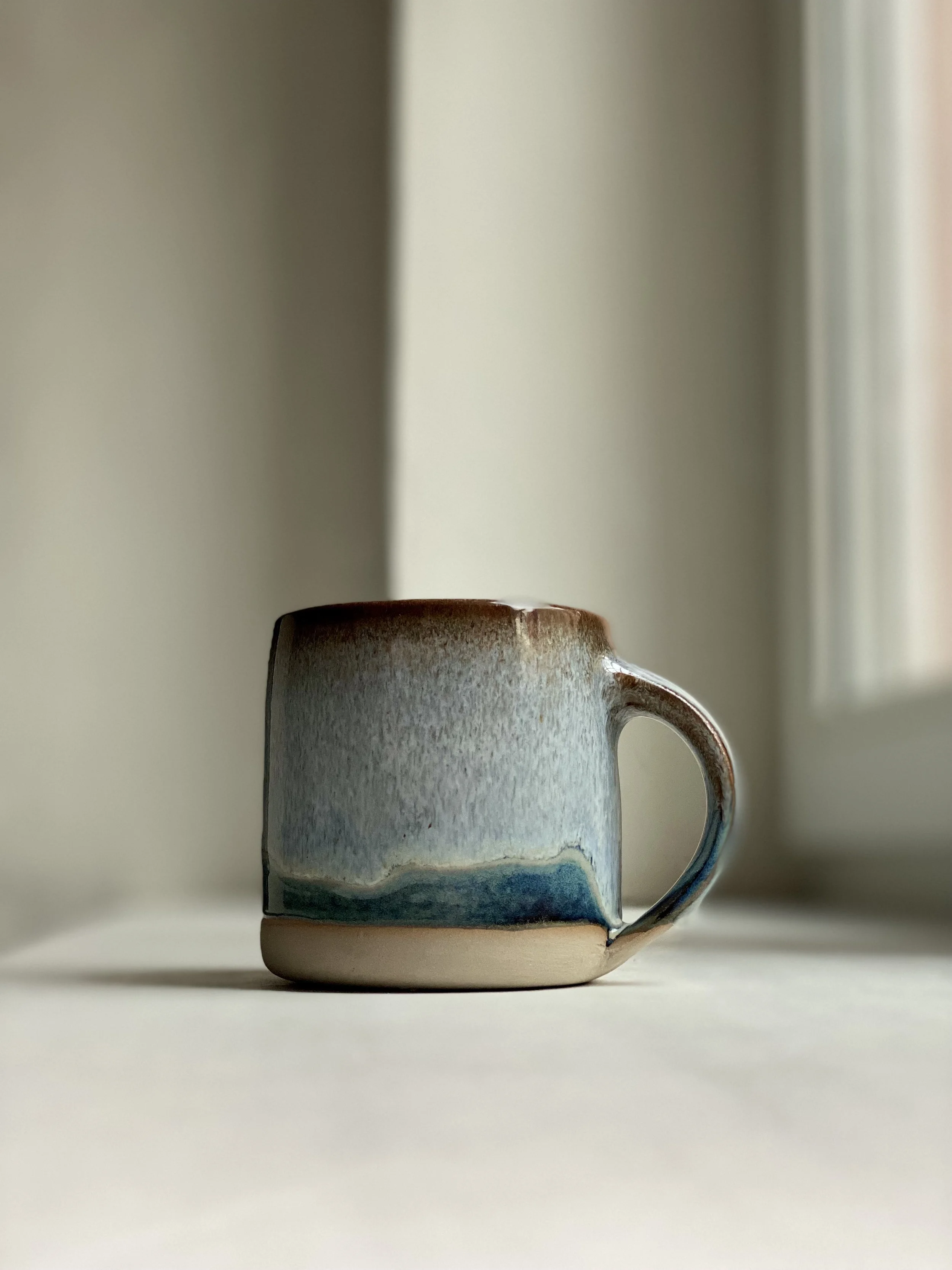 Hrníček s ouškem z šedé krémové hlíny. Na vnější straně s krásným šedým floating efektem, uvnitř glazura Big Blue. Objem je okolo 275 ml.